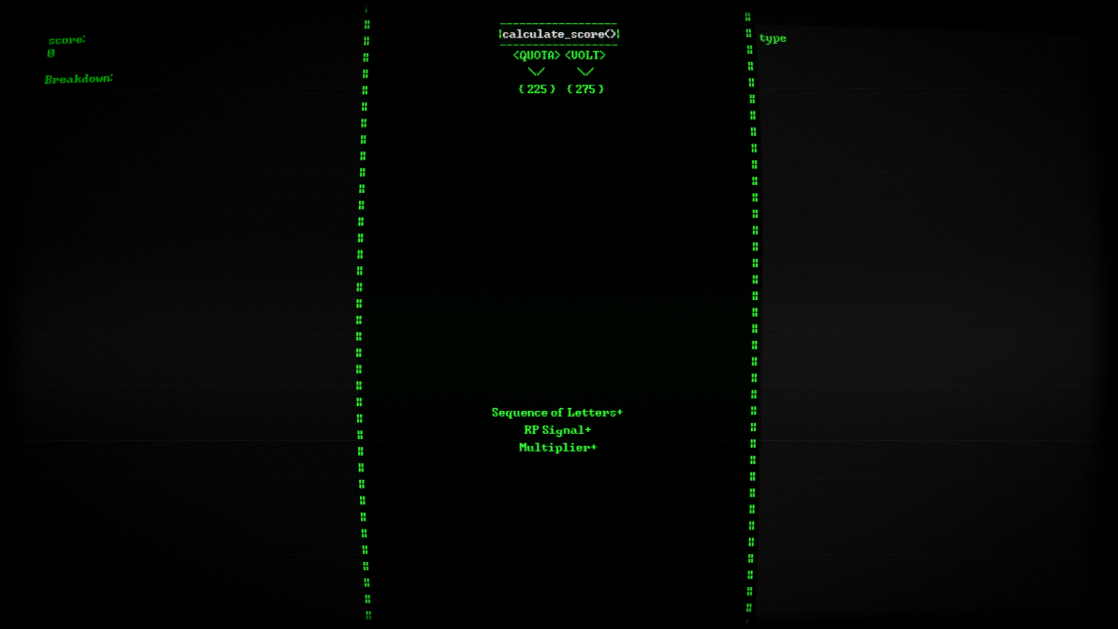Your goal in <SS/R> is to type strings to meet a given quota without exceeding the Voltage. You gain [or lose] score by typing a character, word, symbol or digit that follows a rule you have unlocked. You unlock rules after you reach the quota.